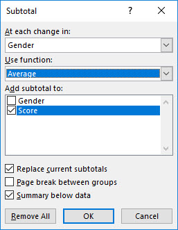 Step 4: In the "Subtotal" window, select "Gender" in the first box, and select a function from the drop-down list (e.g., Average) in the second box;