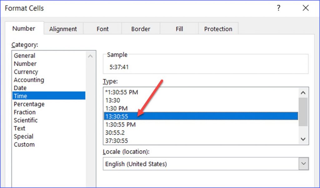 Step 3: In the "Format Cells" window, click "Time" from the left navigation, then select "13:30:55" from the list to include second;