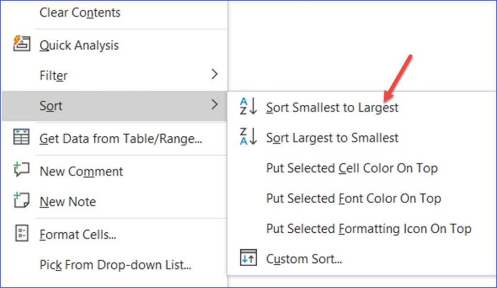 Step 5: Alternatively, right click and select "Sort" from the list; then select "Sort Smallest to Largest".